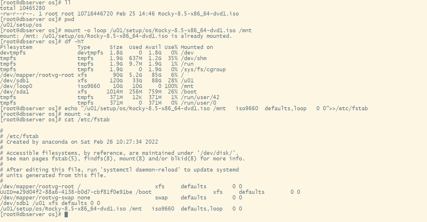 [root@dbserver os]# echo "/u01/setup/os/Rocky-8.5-x86_64-dvd1.iso /mnt iso9660 defaults,loop 0 0">>/etc/fstab