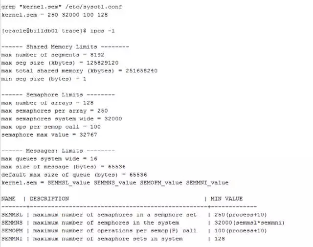 这里看到SEMOPM的值为100,在ORA-27303报错时,显示值112,大于系统配置的100的,所以LGWR一次SYSTEM CALL不能POST所有前台进程,部分前台进程认为LGWR进程出现致命错误,最后导致数据库自动重启。
